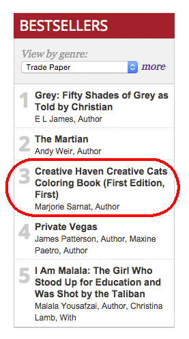 UPDATE: September 14, 2015: Sales of both Creative Cats and Owls continue to perform in the Top 25 of all trade paperbacks in Publishers Weekly bestsellers list.